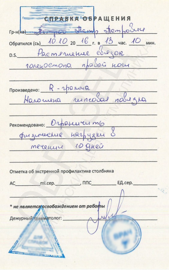 Справка из травмпункта – это документация, которая подтверждает у человека наличие травмы опорно-двигательной системы. Выдается при сильном ушибе, переломах различной степени, вывихах, растяжениях связок. Медицинский документ оформляется в день обращения травматологом или хирургом. Он требуется при предъявлении на месте трудовой деятельности, учебы для подтверждения уважительного отсутствия и временной трудовой неспособности. Получить медсправку в нашем медицинском центре можно с доставкой по Москве.
