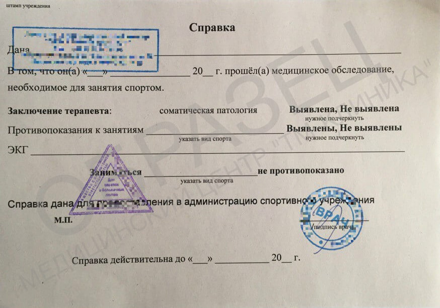 Высокие физические нагрузки — стресс для организма. Поэтому при наличии хронических патологий и острых инфекционных заболеваний они противопоказаны. Администрация спортивных клубов, руководители и педагоги образовательных учреждений, организаторы соревнований не имеют права допускать людей с противопоказаниями к занятиям. Они требуют документального подтверждения состояния здоровья. Поэтому справку от врача для занятий спортом оформляют: